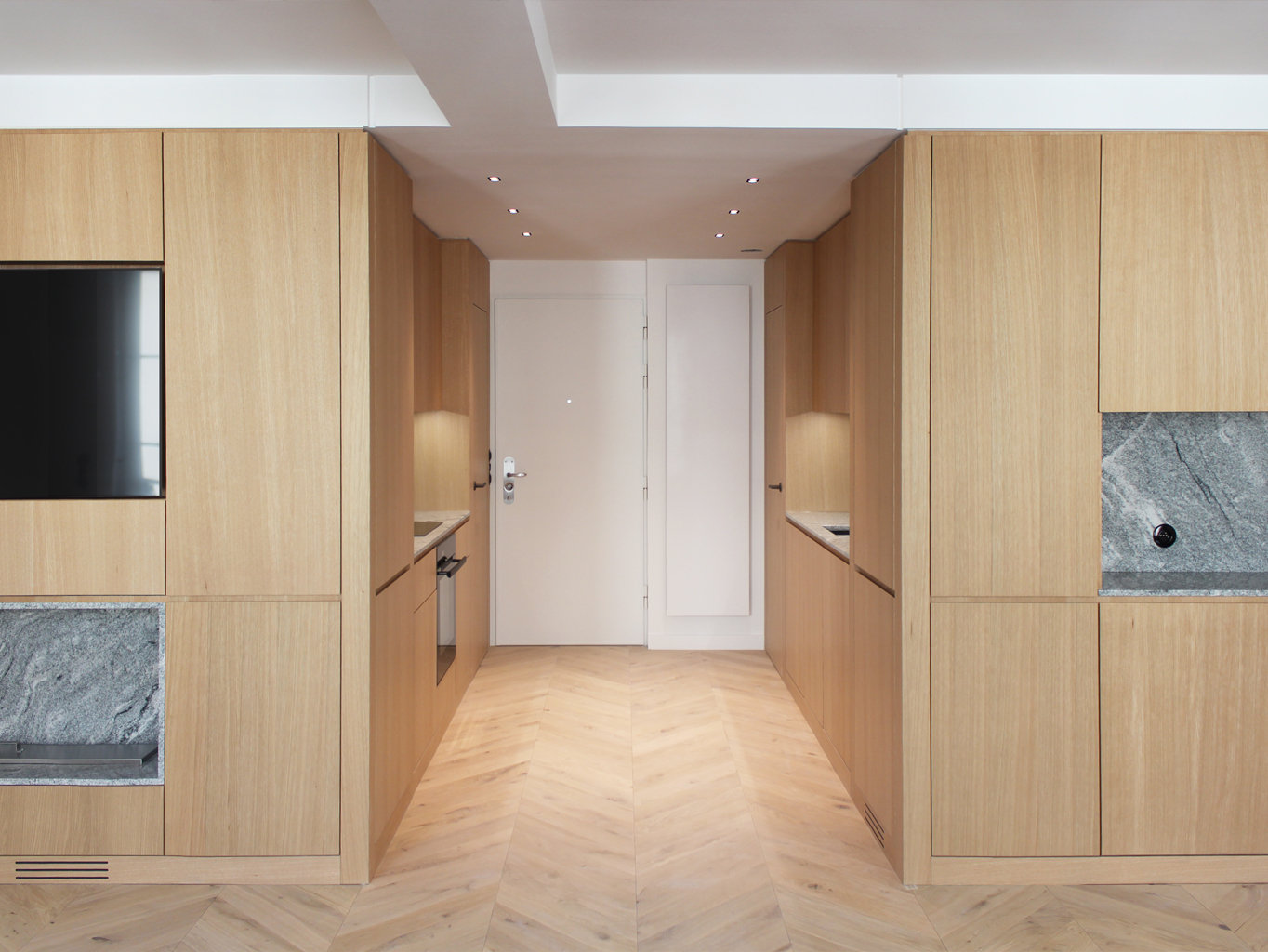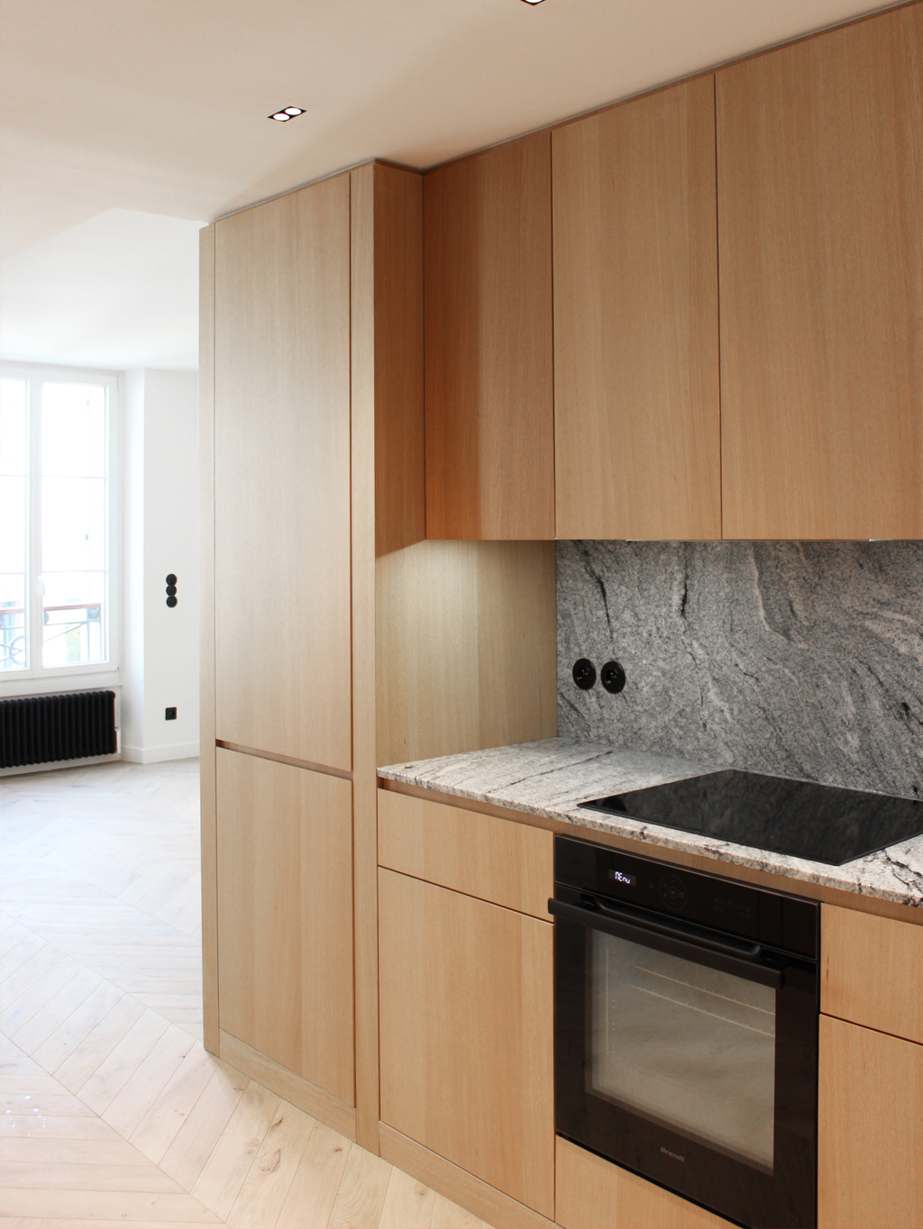 Dans sa nouvelle configuration, l’appartement rayonne autour de son entrée : épine dorsale de la distribution, s’y loge la cuisine divisée en un coin préparation et un coin lavage. Le passage dessiné par les deux blocs s’ouvre ensuite sur la large pièce à vivre pour y définir d’un côté la salle à manger avec vaisselier et rangements multiples, et de l’autre le salon avec son « plasma » géant et sa cheminée intégrés. Le chêne miel et le granit blanc veiné de noir apportent leur force naturelle à la composition.